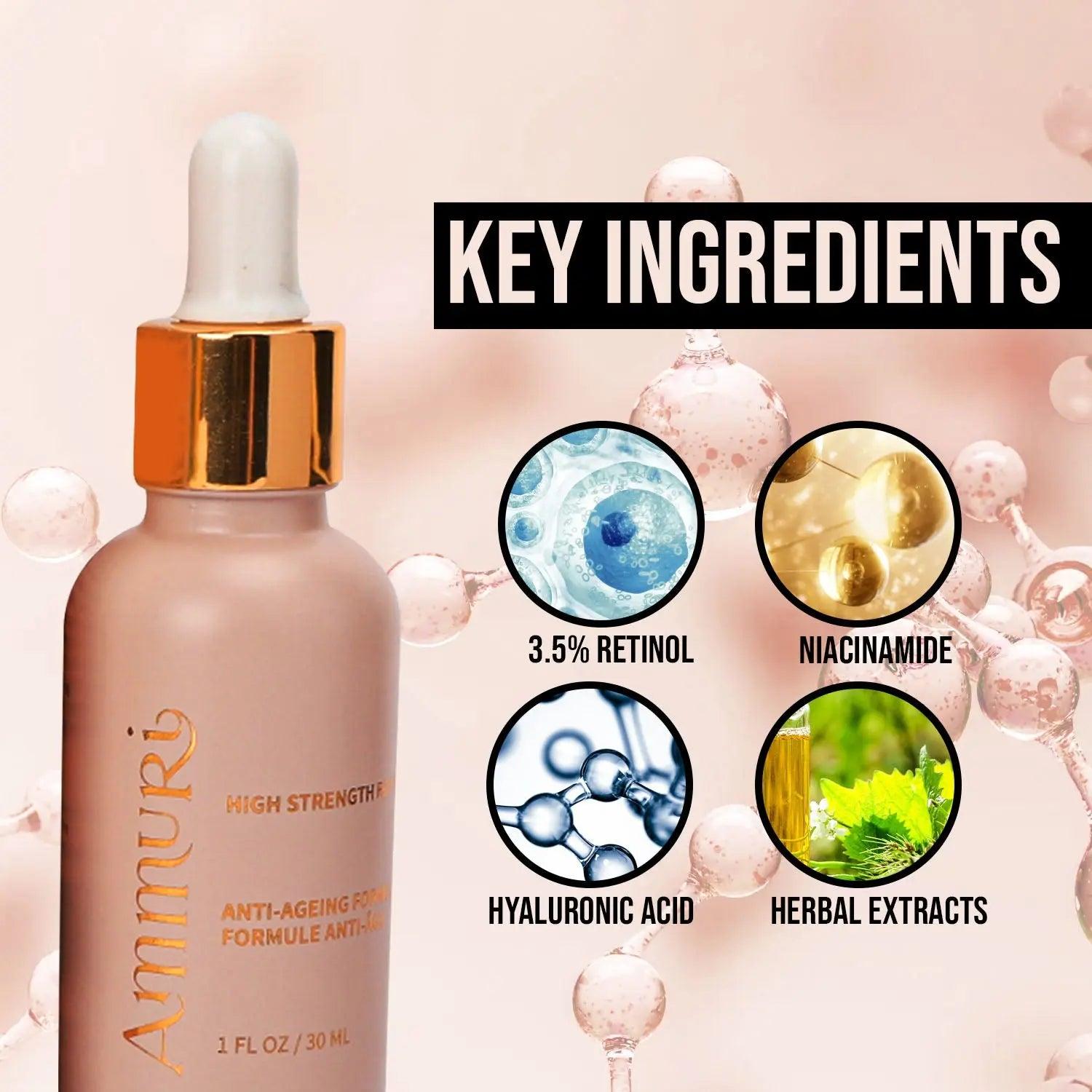 Introducing Ammuri Skincare's High Strength Retinol 3.5% Serum, a breakthrough in anti-aging skincare. This high strength retinol serum targets signs of aging and transforms your appearance. It offers powerful benefits for both men and women.