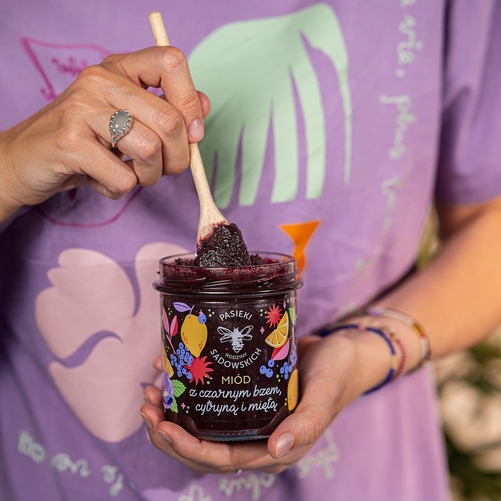 The natural sweetness of multifloral honey combined with freeze-dried elderberries, lemon, and a subtle hint of mint creates a unique, refreshing taste composition. This harmonious blend of sweetness and tanginess, enriched with the freshness of mint, evokes summer mornings and moments of outdoor relaxation. The limited edition merges the traditional taste of honey with original additions, making it an excellent choice for desserts, beverages, or as a sweet touch to everyday meals.